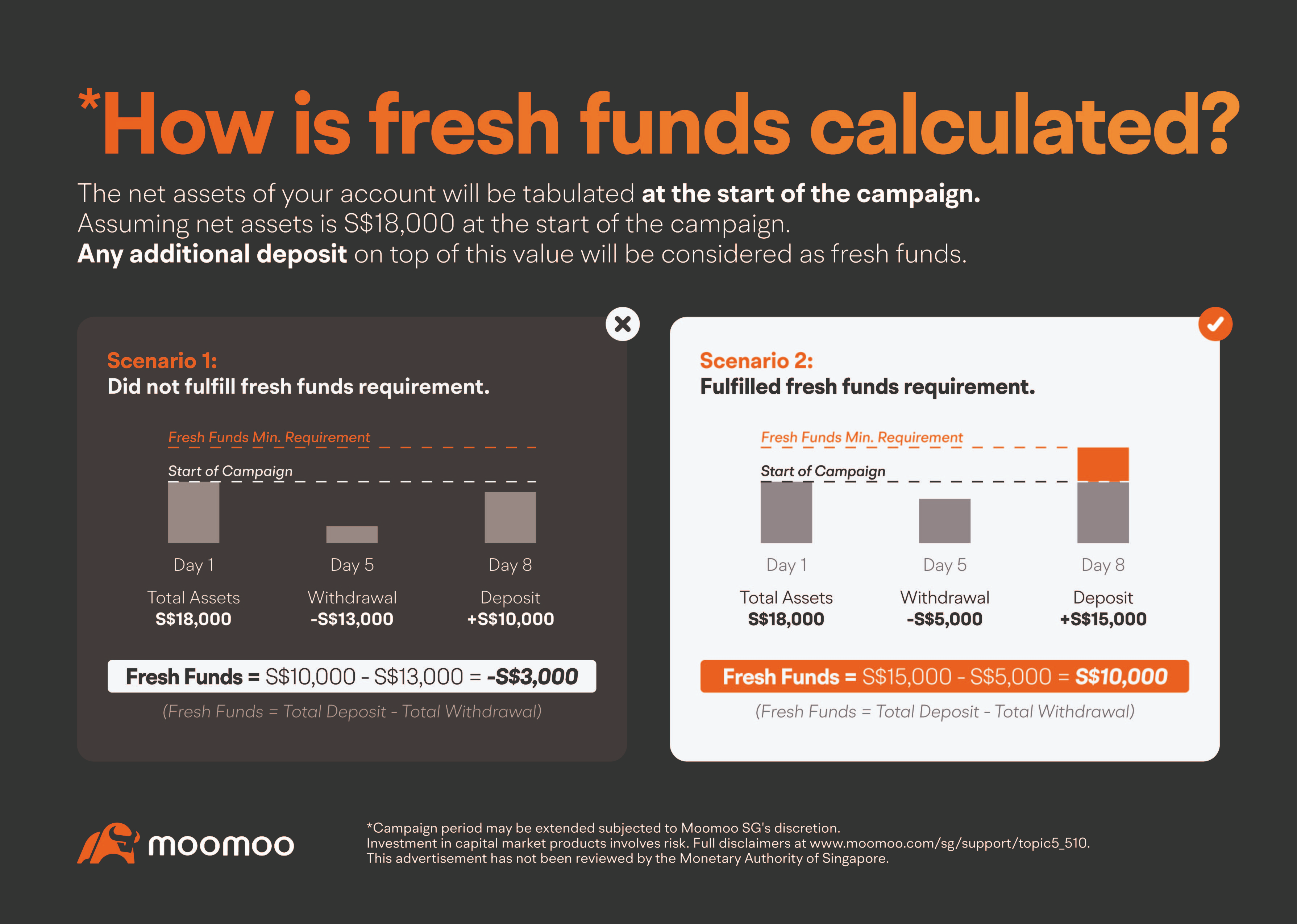 Should a user not fulfil all the stated conditions of this Campaign/Promotion event, Moomoo SG reserves the right to cancel all offers or benefits promised in this event. Commissions and fees will then be charged by Moomoo SG as per normal standards.